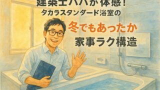 【建築士パパの体験レビュー】タカラスタンダードの浴室をショールームで徹底チェック!冬でもあったかい理由、ホーロー素材のメリット、家事ラクのマグネット収納まで建築士目線で詳しく解説。寒いお風呂を快適にしたい人必見のPR記事です。