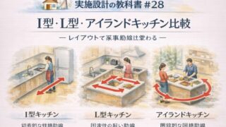 いえのキホン 🏠📐✨ 実施設計の教科書#28🍳📐 I型・L型・アイランドキッチン比較― レイアウトで家事動線は変わる ― 👓🍽️🏡