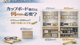 いえのキホン 🏠📐✨ 実施設計の教科書#29 🧺📏 カップボード奥行は何mm必要? ― 450mm?600mm?収納で失敗しない寸法 ― 👓🍳