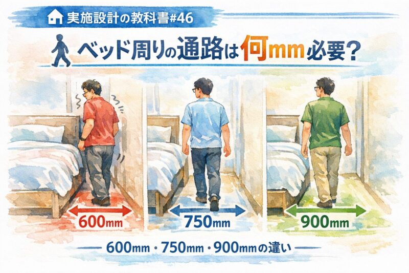 🏠📐✨ 実施設計の教科書#46🚶🛏️ ベッド周りの通路は何mm必要?― 600mm・750mm・900mmの違い ― 👓📏