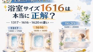 いえのキホン 🏠📐✨ 実施設計の教科書#20🛁✨ 浴室サイズ1616は本当に正解?― 1317・1616・1620の違い ― 👓📏 シリーズ統一テンプレで作りました。 --- **スラッグ:** `jisshitsu-bathroom-size-1616` **メタディスクリプション:** 🏠✨ 浴室サイズ1616は本当に正解?🛁 1317・1616・1620の違いを一級建築士👓が解説📏 家族構成や使い方で変わる浴室サイズの選び方を紹介します✨ 2026.03.14 いえのキホン