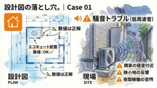 メガネのしごと 🏠📐✨ 設計図の落とし穴。|Case 01🔊⚠️ エコキュートの配置。数値は正解、現場は失敗。 エコキュートの配置で失敗する原因は「距離」ではなく「音の向き」にあります。図面では正解でも、隣家との関係や夜間の低周波でトラブルになるケースも。建築士の実体験から、後悔しない配置の考え方を解説します👓🔊 2026.04.23 メガネのしごと